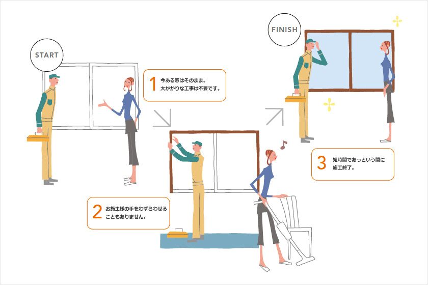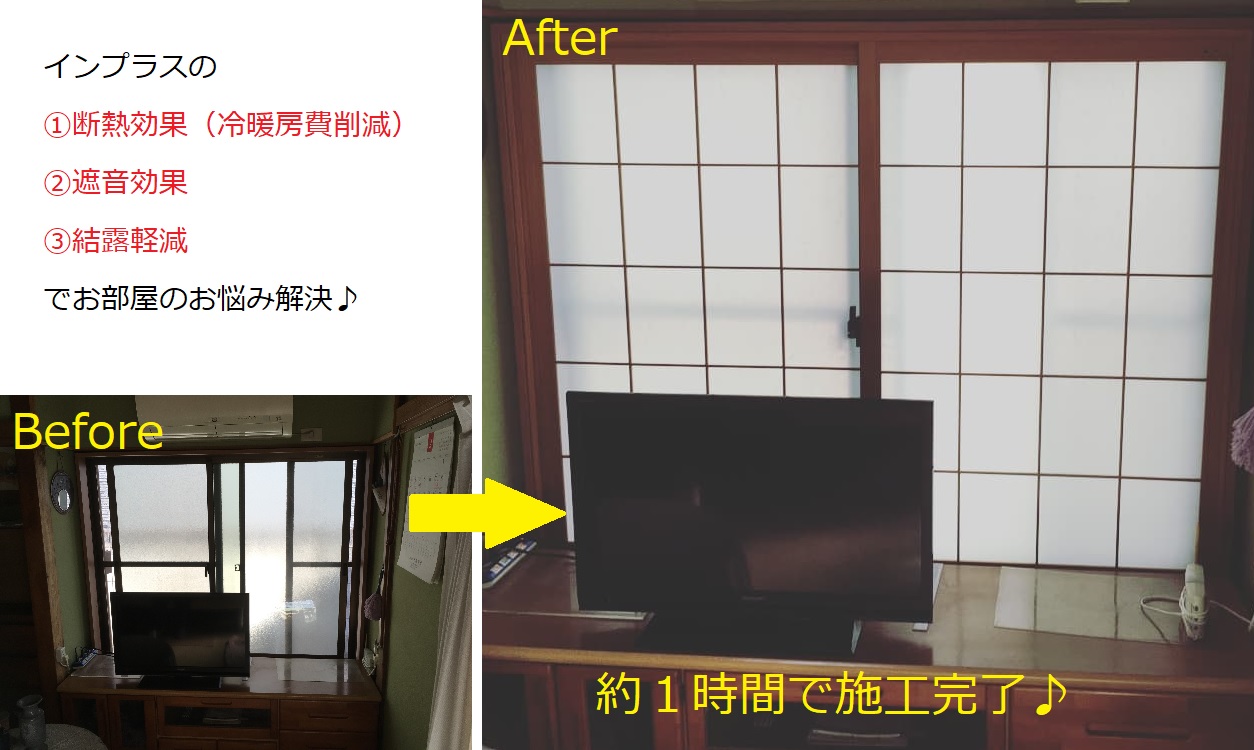 インプラスの断熱効果で、夏の冷房費、冬の暖房費の節約には効果的なのはもちろん、二重窓になることで防音の効果も期待できます。